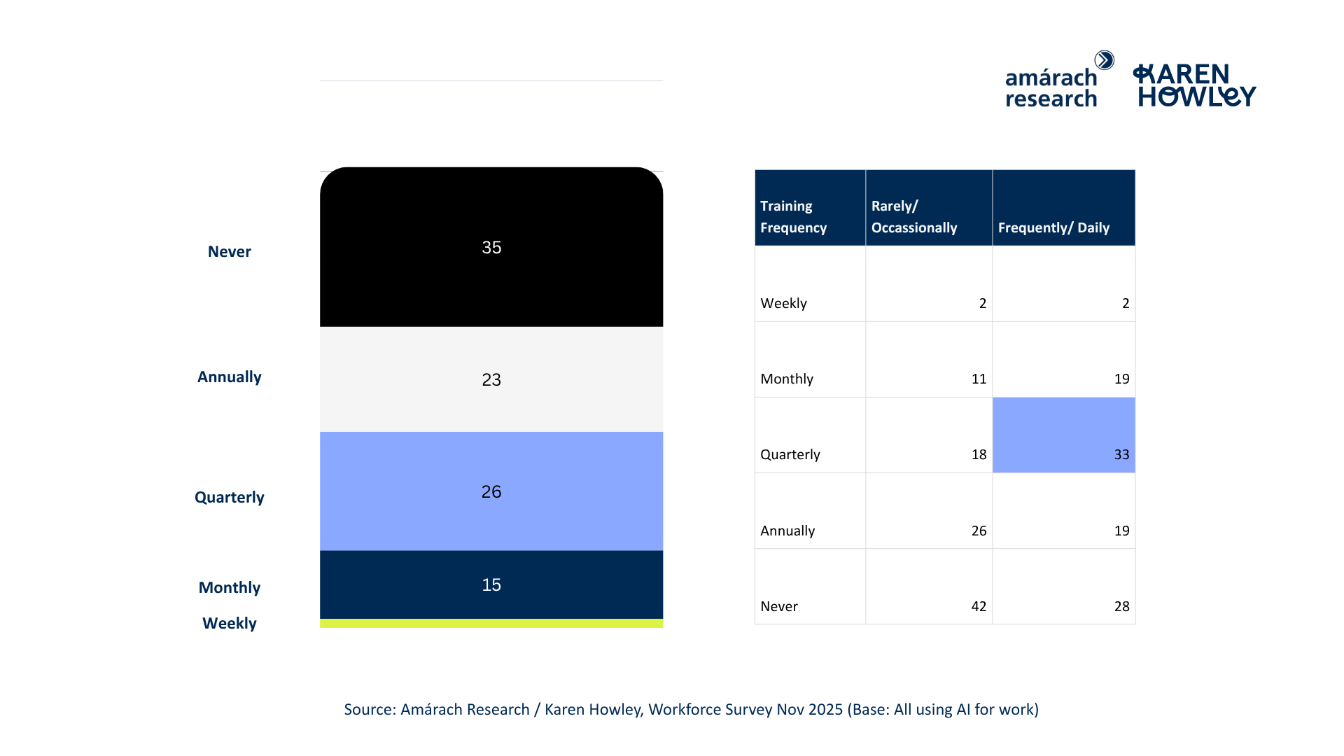 We see a clear pattern emerging in the data - learning drives use. Almost three-quarters of frequent users have received some form of AI training or informal learning, compared with just 58% of infrequent users. Among those with no training (33%), 42% use AI rarely.