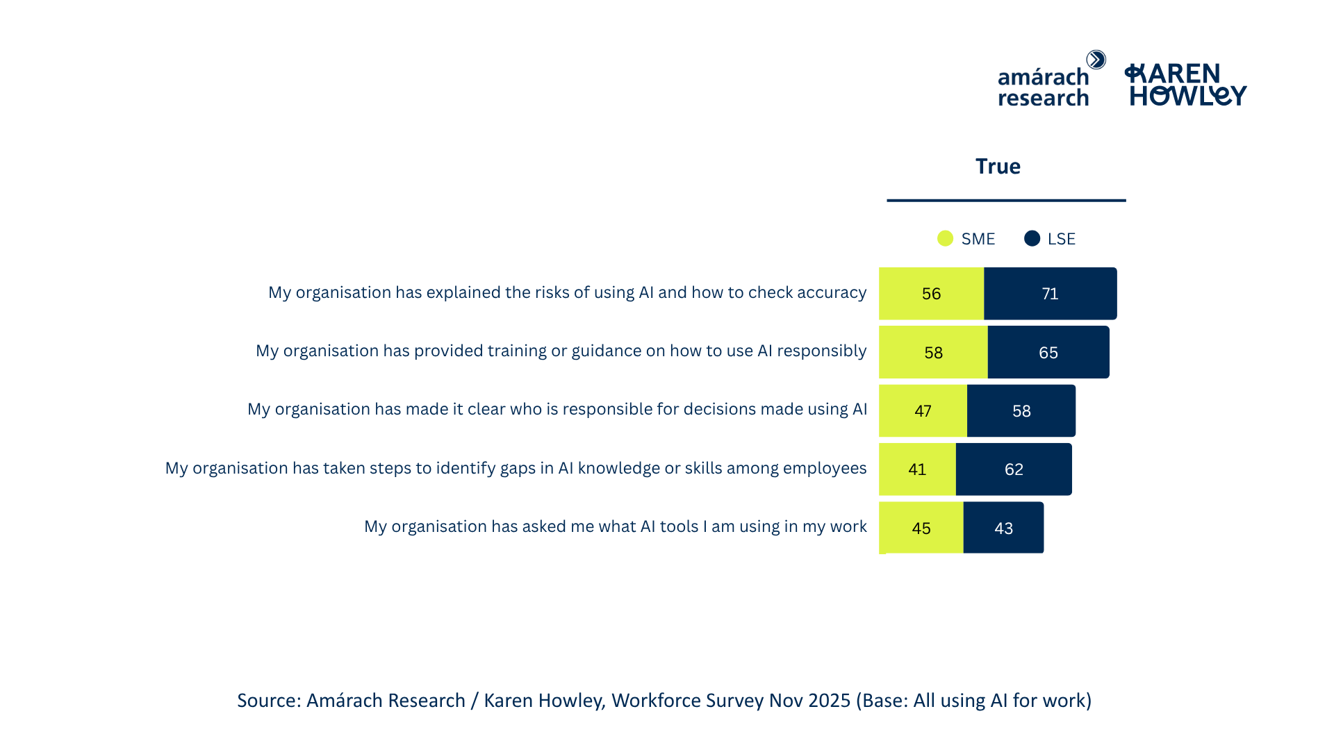 These figures show progress, but also complacency. Even in large employers, nearly three in ten workers say AI risks have not been explained, and over a third have no clarity on accountability. Governance maturity is emerging, but not embedded.