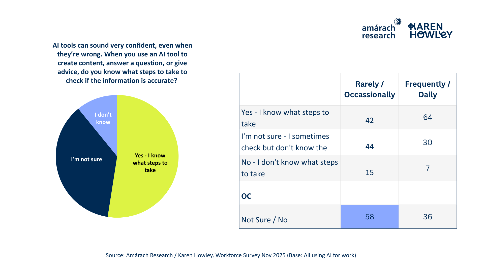 Frequent users are far more likely to know how to verify content than occasional users - evidence that experience builds discernment. But technical familiarity alone is not enough. Employees need the critical thinking skills to cross-check, question, and challenge AI outputs before they enter public or organisational circulation.