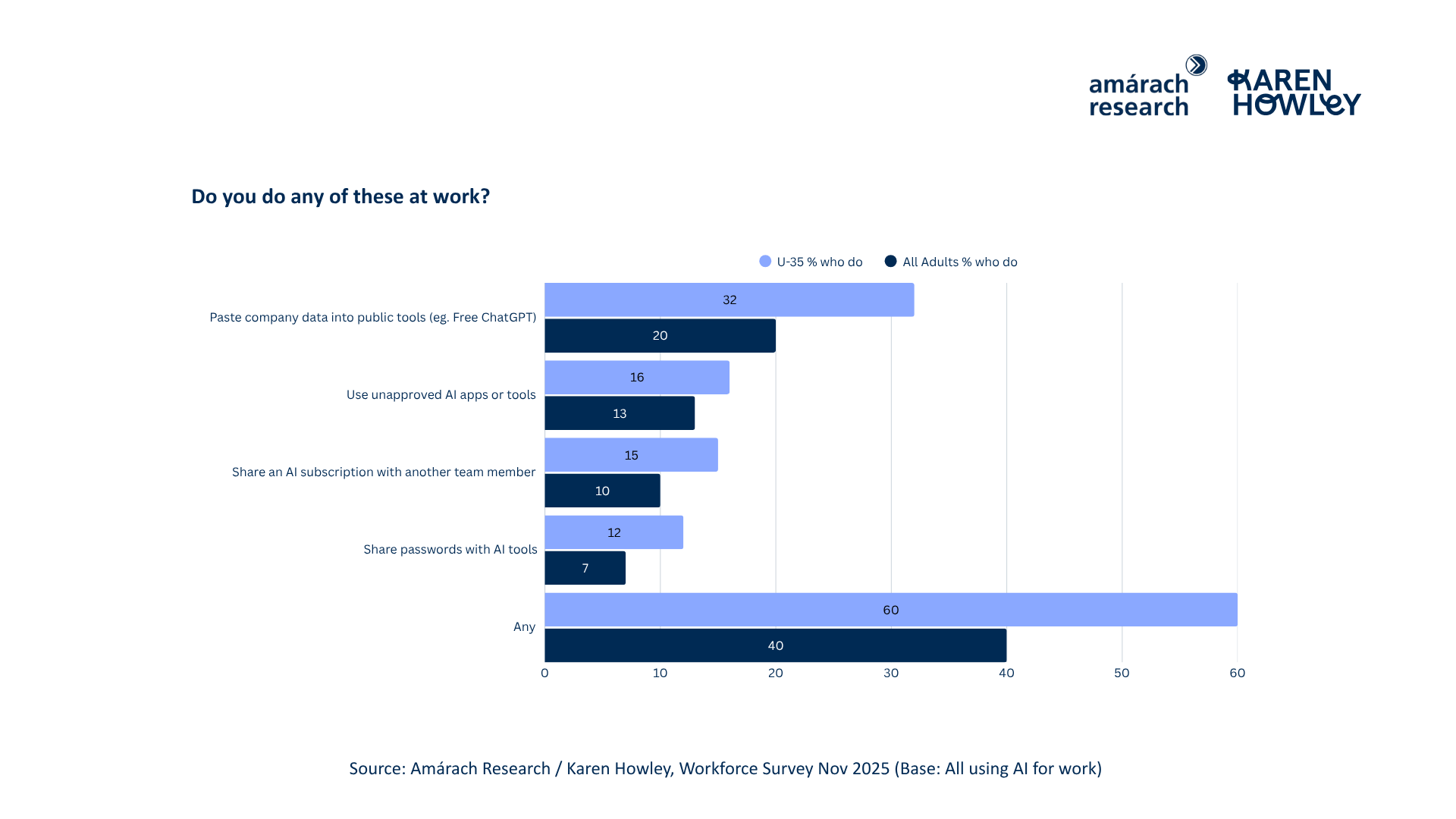 One in three employees using AI have pasted company data into public AI tools or used unapproved AI tools at work. Younger workers are most likely to engage in these practices, reflecting both confidence and complacency.