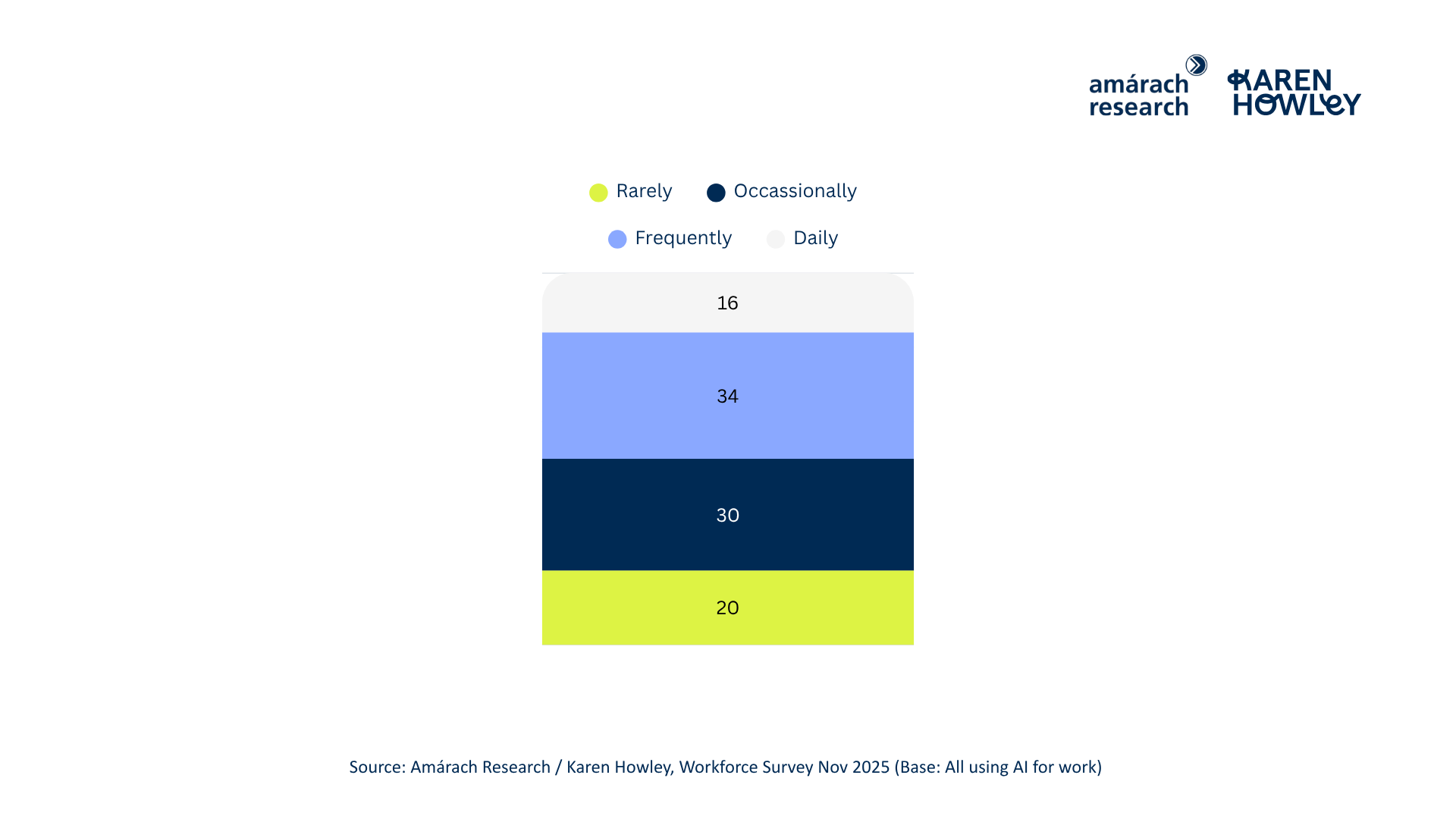AI use is growing fast, but true adoption remains limited. Only 16% use it daily, while half engage just a few times a week or less.